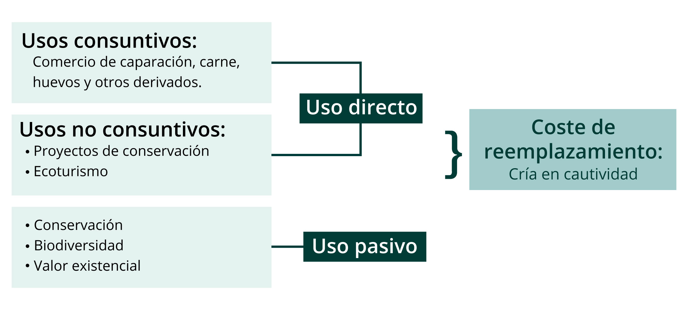 Figura: Coste de reemplazamiento se divide en 2: uso directo y uso pasivo, donde el uso pasivo maneja la conservación, biodiversidad y valor existencial, y el directo se subdivide en usos consultivos, que involucra el comercio de caparación, carne, huevos y otros derivados; y en usos no consultivos, que se encargan del proyecto de conservación y ecoturismo. Los usos directos y pasivos se le dan a la tortuga marina cuando llega a tierra, según González y Melero (2014).