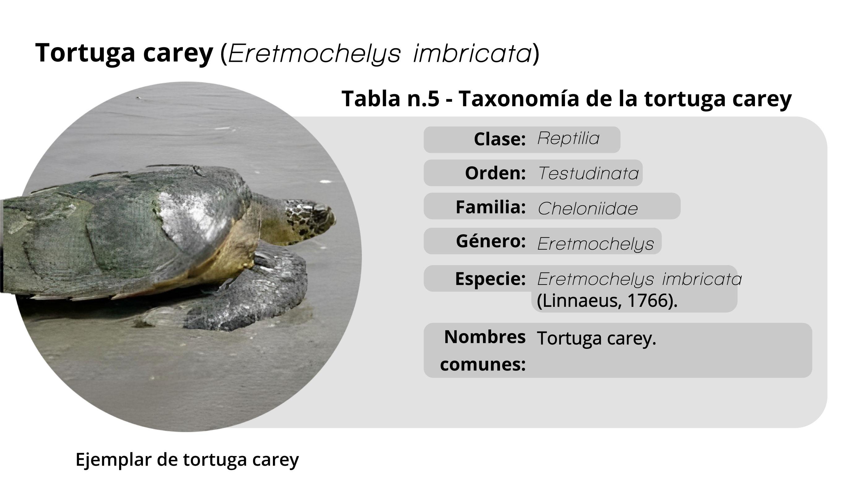 Tortuga baula - Clase: Reptilia; Orden: Testudinata; Familia: Cheloniidae; Género: Eretmochelys; Especie: Eretmochelys imbricata (Linnaeus, 1766); Nombres comunes: tortuga carey.