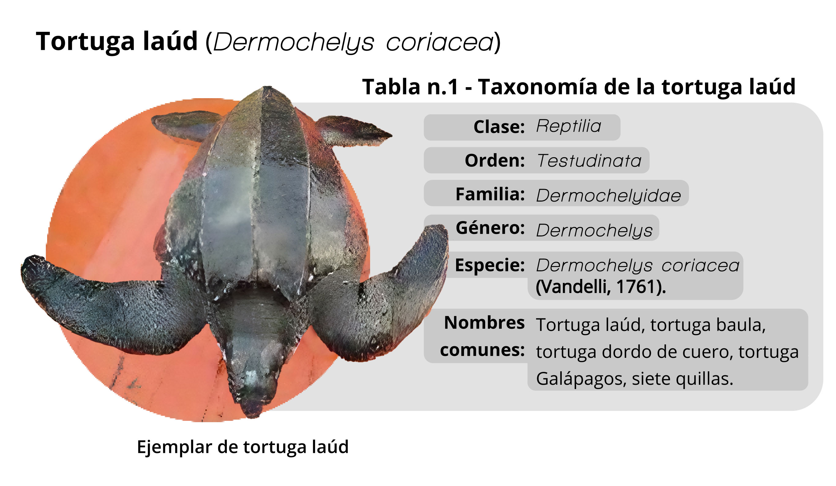 Tortuga laúd o baula - Clase: Reptilia; Orden: Testudinata; Familia: Dermochelyidae; Género: Dermochelys; Especie: Dermochelys coriacea (Vandelli, 1761); Nombres comunes: tortuga laúd, tortuga baula, tortuga dordo de cuero, tortuga Galápagos, siete quillas.