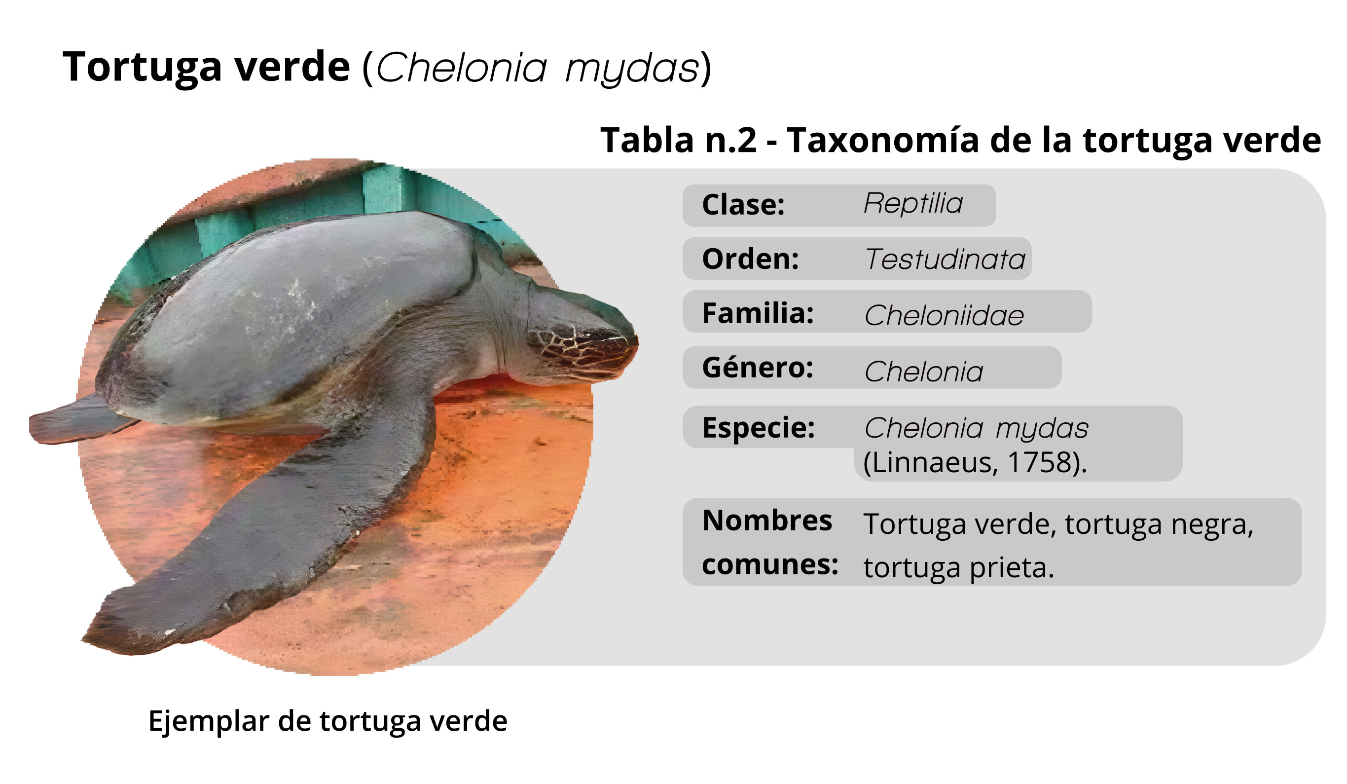 Tortuga negra o verde - Clase: Reptilia; Orden: Testudinata; Familia: Cheloniidae; Género: Chelonia; Especie: Chelonia mydas (Linnaeus, 1758); Nombres comunes: tortuga verde, tortuga negra, tortuga prieta.