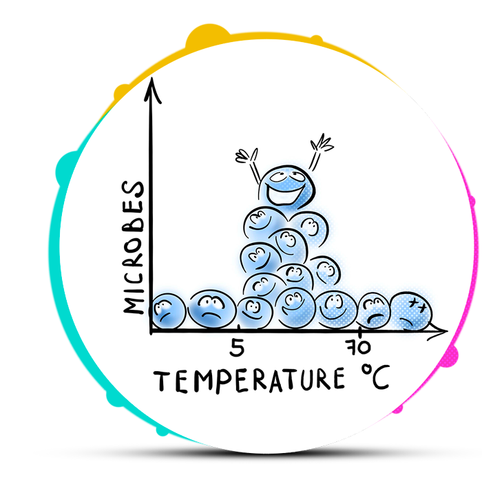 La mayoría de las bacterias, levaduras y mohos crecen y se multiplican cuando un alimento está expuesto a temperaturas entre los 5 y 70 °C. Por ello es necesario evitar que los alimentos estén a esas temperaturas por mucho tiempo.