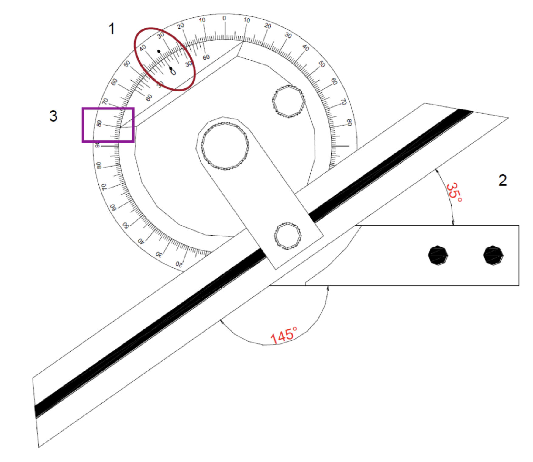 Si observemos la figura adjunta, vemos que 0 está en línea con 35 (punto 1) por lo tanto está midiendo 35° 0” y este valor salió de acuerdo con lo que se midió el (punto 2). Para reforzar esta medida podemos apoyarnos de la página siguiente.
