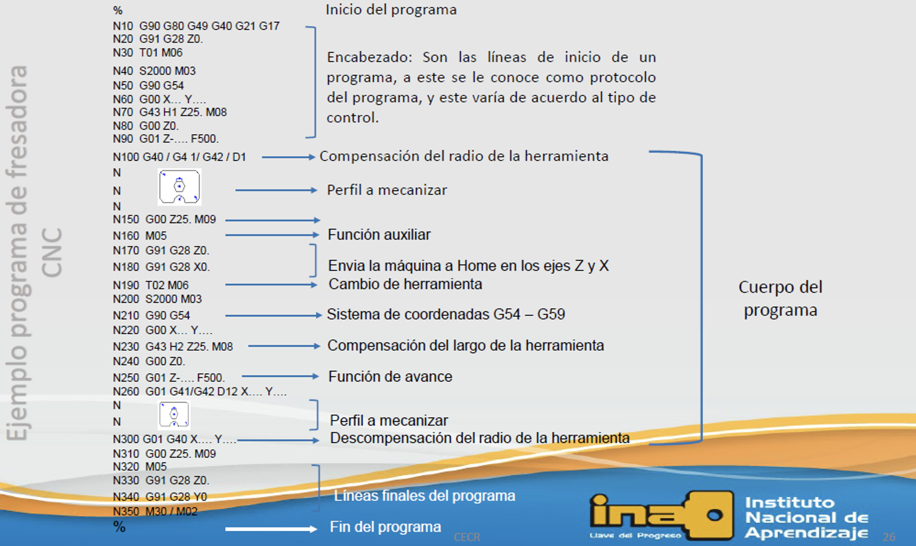 La siguiente imagen muestra un ejemplo de cómo está formado un programa CNC: