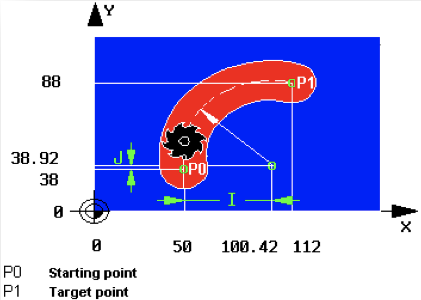 Orden programada G02 X112. Y88. Z0. I-50.12 J-0.92 R.