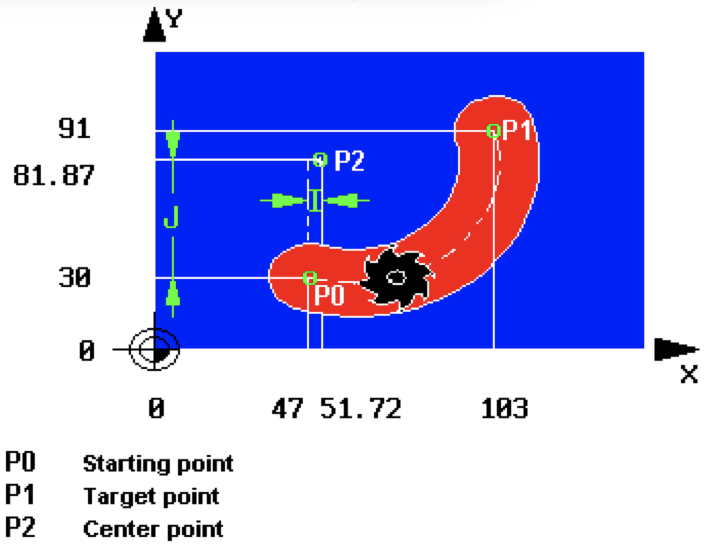 Orden programada G03 X103. Y91. Z0. I-4.72 J-51.87.