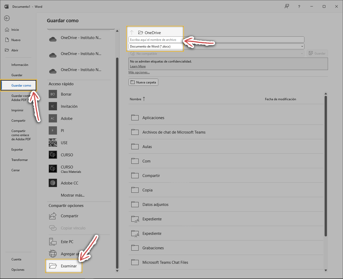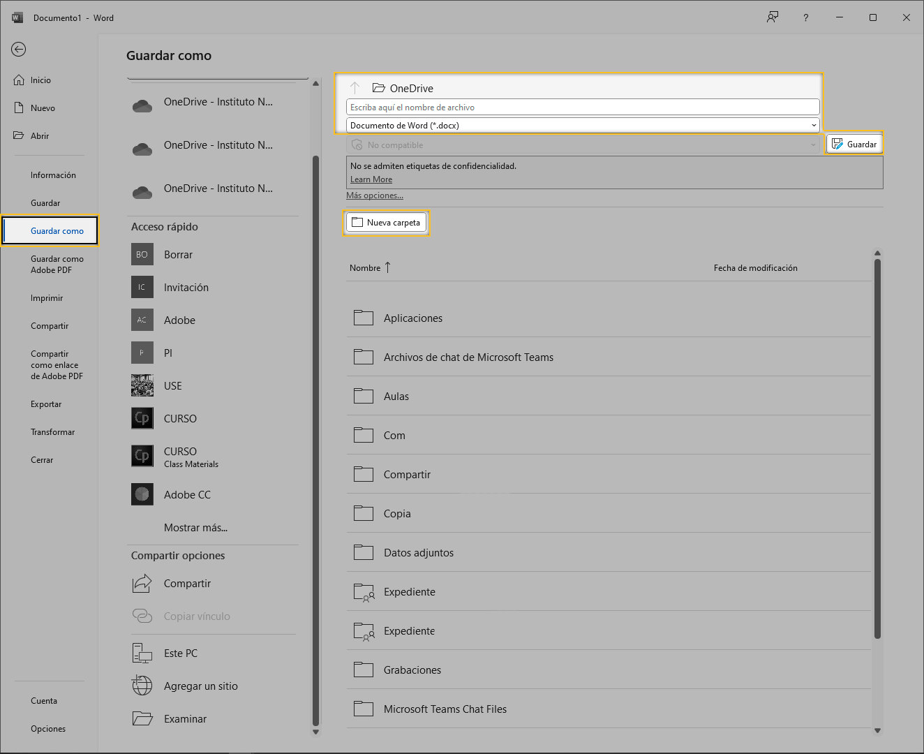 2.Seleccione la opción "Guardar como", para guardar su trabajo en su computadora o en OneDrive.