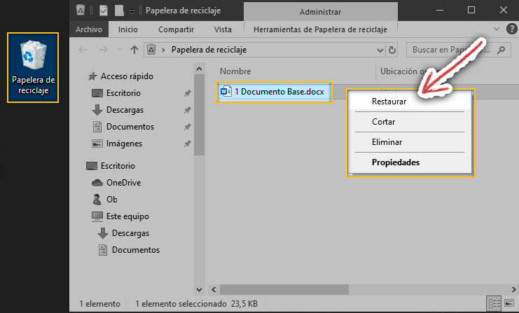 - Si encontró el archivo de Word deseado, haga clic con el botón derecho sobre el nombre del archivo y luego seleccione Restaurar, para recuperar el archivo.