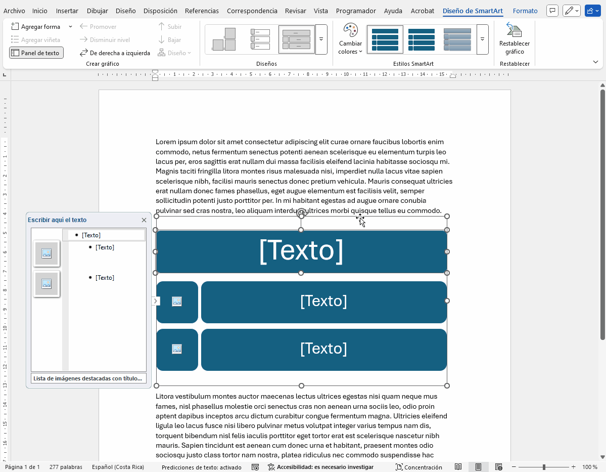 Nota: Escriba el texto en el cuadro que aparece al lado izquierdo (como se ve en la siguiente imagen) y se irá acomodando en cada figura contenida en el SmartArt que usted escogió.