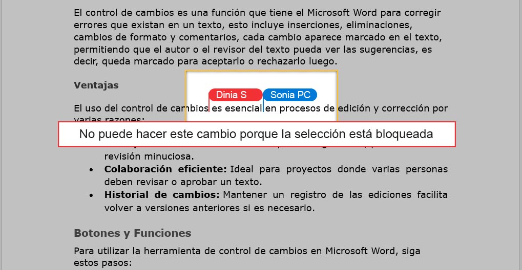 Cuando varias personas usuarias están realizando cambios en el documento compartido, es posible que haya conflictos, ya que puede suceder que dos usuarios(as) estén modificando una misma parte del documento a la vez. Word no lo permite, bloquea la edición del segundo usuario o usuaria, hasta que acabe la primera persona. Para ello, aparece el siguiente mensaje:
