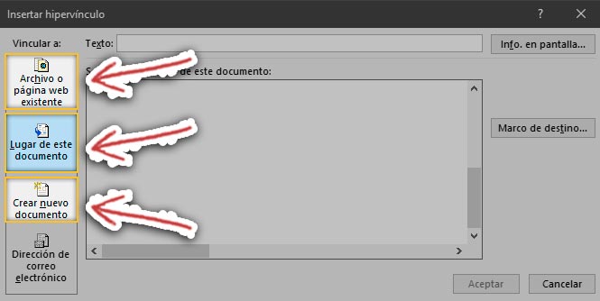 O, si quiere enlazar a otra parte del mismo documento, seleccione Lugar de este documento y elija el marcador o encabezado correspondiente.