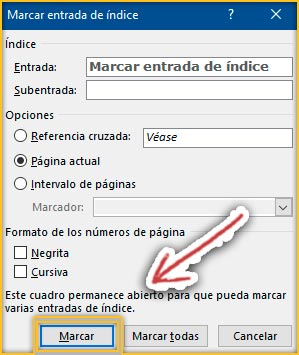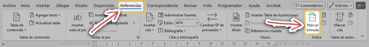 Para crear un índice, se marcan las entradas del índice, indicando el nombre de la entrada principal.