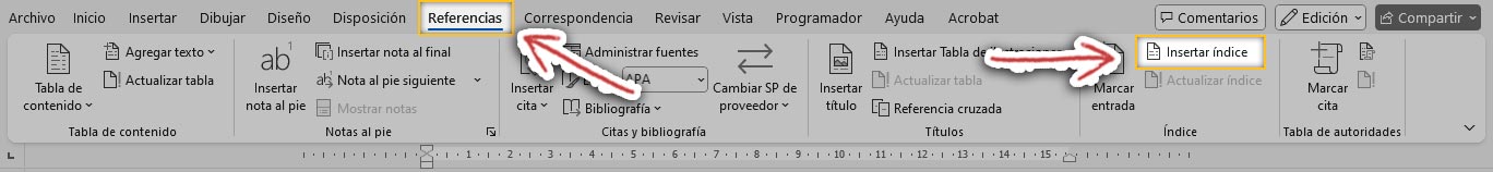 b) Haga clic en la pestaña Referencias de la barra de menú y dé clic en el botón Insertar índice.