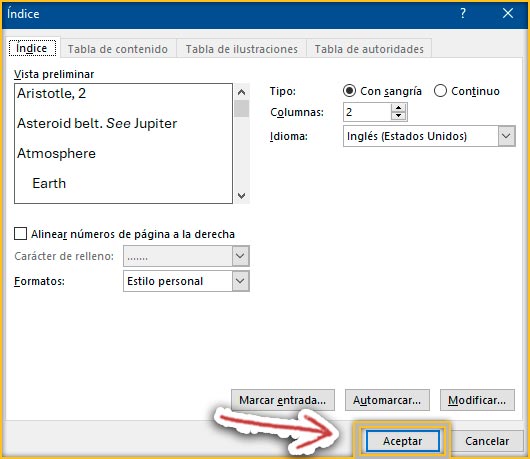 7. En el cuadro de diálogo Índice, para mejorar el aspecto del índice, se puede elegir el formato de las entradas de texto, números de páginas, pestañas y caracteres de relleno.