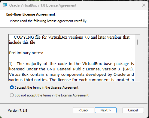 Acepte los términos del acuerdo de licencia, haciendo clic sobre la primera opción y presionando el botón Next.