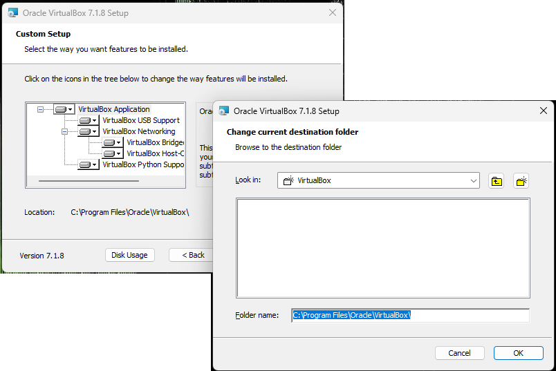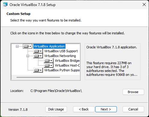 De forma automática se ubica en C:\Program Files\Oracle\VirtualBox\ pero la persona usuaria puede modificar esta ubicación presionando el botón Browse y definiendo una nueva ubicación: