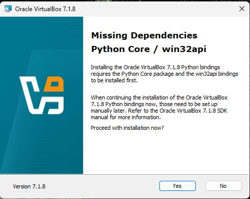 Aparece otra ventana emergente con un aviso sobre la instalación de dependencias de Python Core que son necesarias. Presione el botón Yes a la pregunta sobre si desea proceder con la instalación.