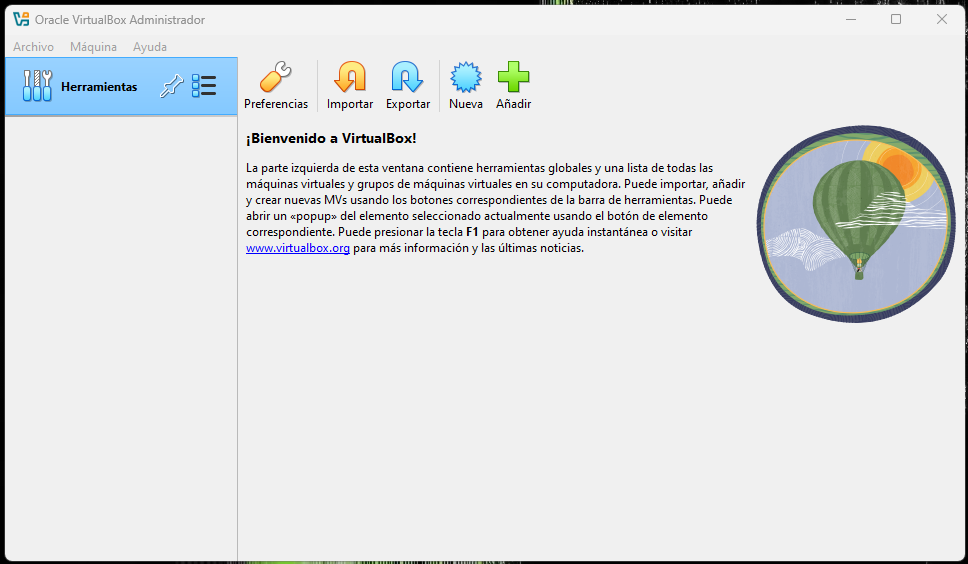 La ventana de la aplicación presenta diversas opciones, pero para los efectos de este curso solamente se va a experimentar con la creación de una nueva máquina virtual, para realizar la instalación del sistema operativo Linux.