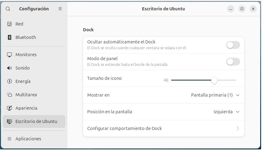 El Dock es la barra que de forma predeterminada se encuentra en la parte izquierda del escritorio y contiene algunos íconos propios después de la instalación de Ubuntu; sin embargo, este se puede personalizar según las necesidades de la persona usuaria.