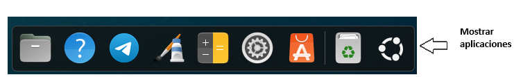 Al hacer clic en este ícono, se despliega una vista con todas las aplicaciones, permitiendo a la persona usuaria iniciarlas de inmediato. Se pueden agregar al Dock directamente pulsando un clic secundario sobre el ícono y seleccionando la opción correspondiente (Fijar al tablero o Pin to Dock). Otra opción para agregarlo al Dock es una vez que la aplicación está iniciada y el ícono respectivo se muestra en el tablero, haciendo clic secundario sobre este en el Dock y seleccionando la opción.