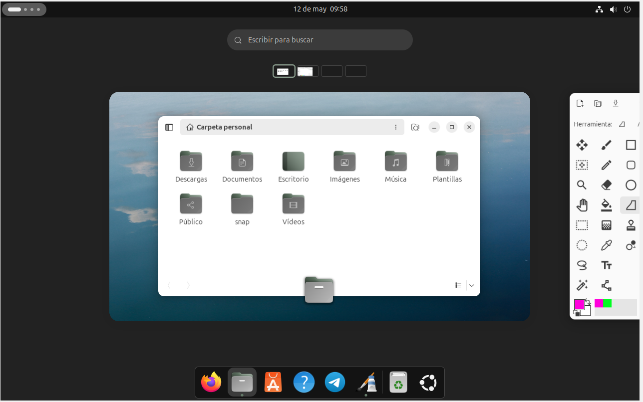 Haciendo clic sobre cada uno de ellos es posible navegar y trabajar de forma independiente, por ejemplo, en la imagen se muestra el escritorio 1 con la Carpeta personal abierta, y en el escritorio 2, la herramienta Pinta ejecutándose.