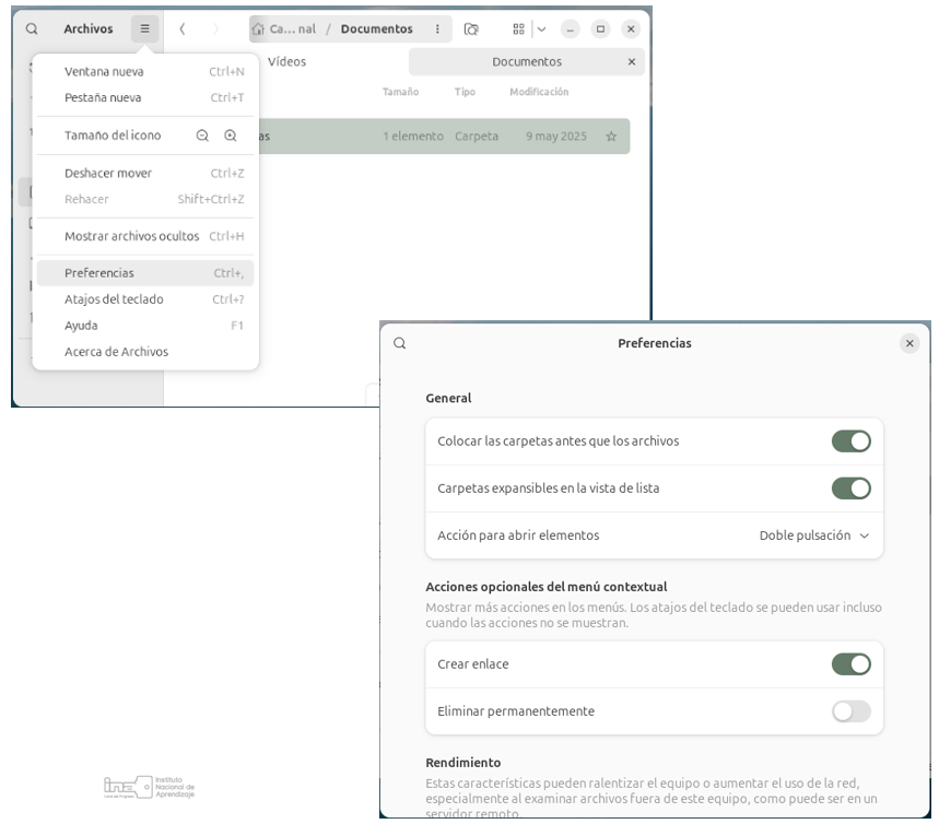 Una de las opciones más interesantes del menú principal es Preferencias. Esta permite personalizar la visualización del contenido, por ejemplo, si desea ver las carpetas antes que los archivos en la vista, el formato de la fecha de cada elemento, y las opciones de información que se muestran en la vista rejilla.