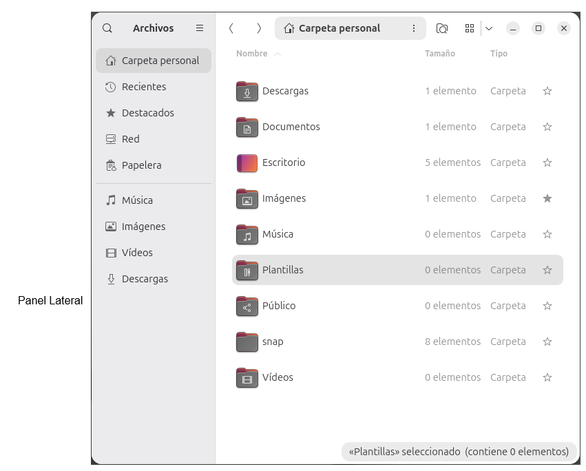 Al abrir la ventana de la aplicación se muestra el contenido de la Carpeta personal y a la izquierda se despliega el Panel lateral, el cual es una parte del gestor de archivos que facilita la administración del contenido.