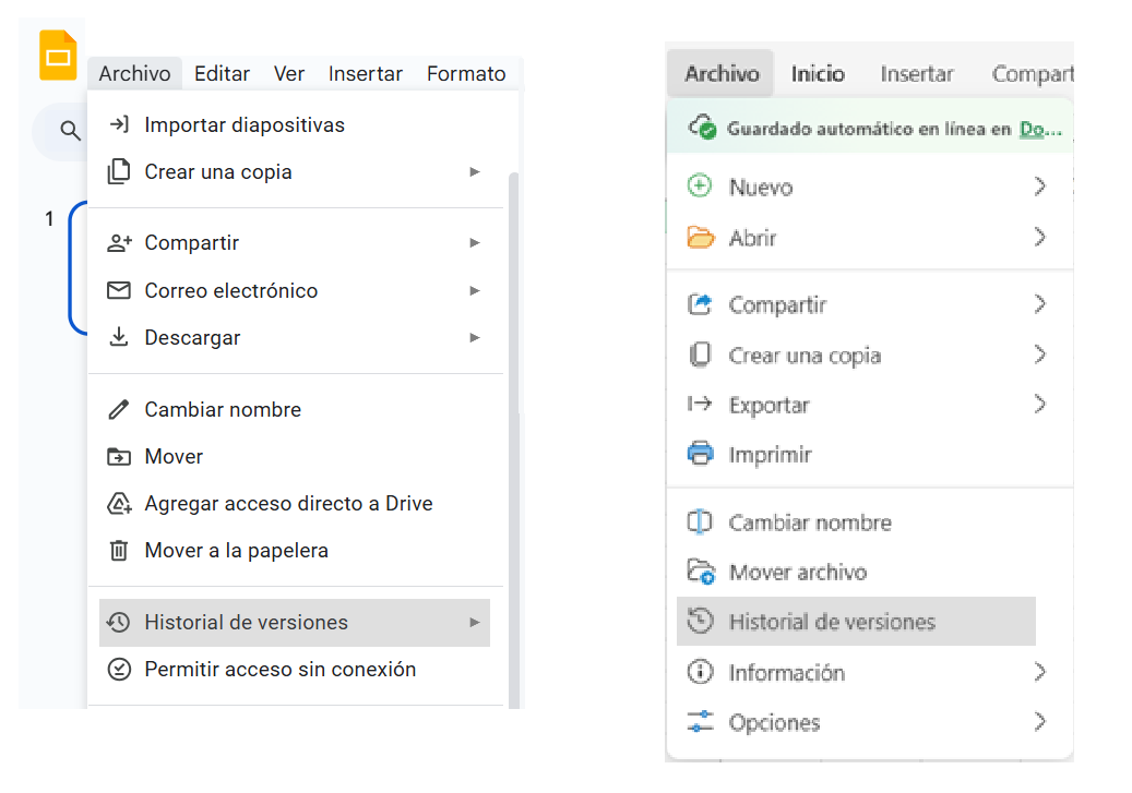 Para acceder al historial de versiones, es necesario tener el archivo abierto en la aplicación respectiva y por medio del menú principal, en la opción de Archivo, buscar la que indique Historial de versiones. En la siguiente imagen se ilustra la forma como se ve, tanto en Drive de Google como en OneDrive.