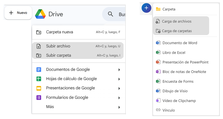 Para subir elementos que estén almacenados localmente, es necesario identificar el botón con un signo de suma (+) Nuevo. Al desplegar las opciones, observe que están las alternativas para subir o cargar archivos, como también subir o cargar carpetas. A continuación, se muestra en Google Drive y en OneDrive, respectivamente.