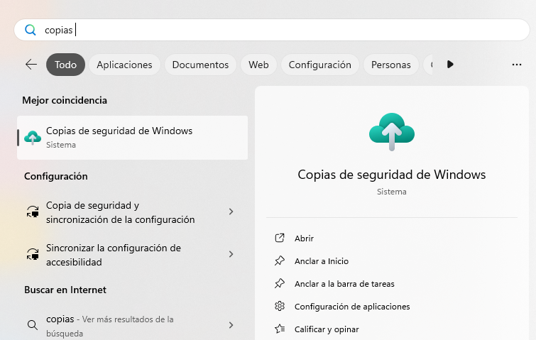 La aplicación para realizar copias de seguridad es fácilmente localizable por medio de buscar desde el botón Inicio.