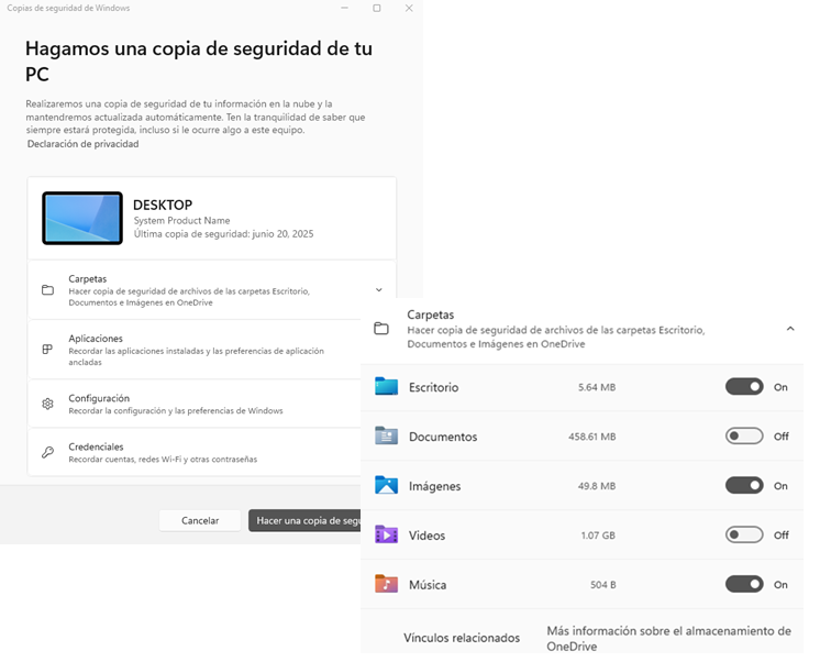 Observe que cada elemento muestra el tamaño, para que la persona pueda estimar el espacio requerido y contrastarlo con el espacio disponible en su almacenamiento. Recuerde que su cuenta de Microsoft le otorga 5 GB de almacenamiento en la nube de forma gratuita.