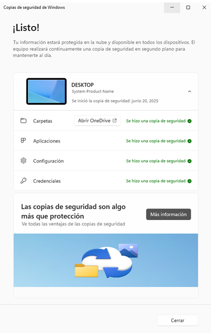 Cuando el sistema se lo indique, la copia de seguridad de los datos de su equipo ha sido realizada. Puede verificar que en el almacenamiento en la nube se han creado las carpetas y los accesos correspondientes.