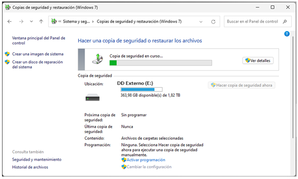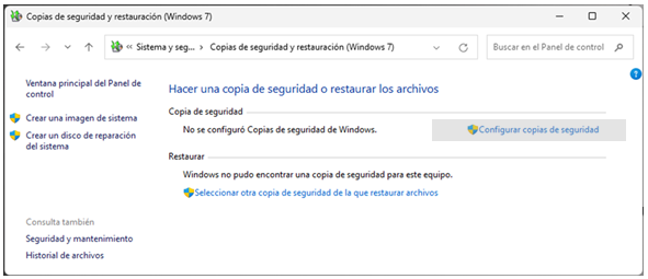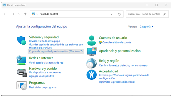 Para emplear esta funcionalidad debe accederse por medio del Panel de control y seleccionar Copias de seguridad y restauración.