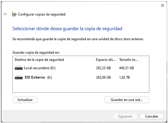 Al seleccionar la opción, se despliegan las unidades de almacenamiento adicionales detectadas por el sistema, de las cuales se debe seleccionar una donde irá a quedar guardado el respaldo que se realice y también se da información sobre el tamaño de la unidad y espacio disponible.