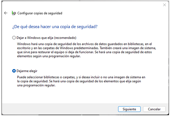 Seguidamente, se define el contenido de la copia de seguridad a realizar; la primera opción se realiza de forma predeterminada para todo el sistema y los datos del usuario, mientras que la segunda permite especificar los elementos que se desea agregar a la copia de seguridad.