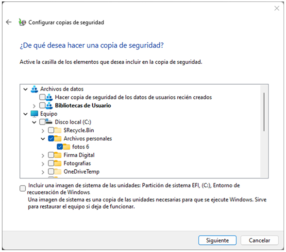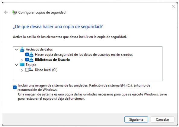 Al seleccionar la segunda alternativa, puede definir los elementos específicos que desea respaldar, incluidos los archivos de datos de usuario y si desea incluir una imagen del sistema. Tome en cuenta que incluir archivos del sistema implica mayor tamaño del respaldo y más tiempo en la realización del proceso.