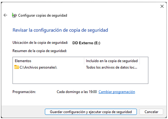 Una vez definidas las carpetas y archivos que desea respaldar, haga clic sobre el botón Siguiente para verificar la información y definir si desea que el respaldo se realice con cierta periodicidad, cambiando la programación. Para respaldos únicos sin programación, inactive esta opción y luego dé clic sobre el botón Guardar configuración y ejecutar copia de seguridad.