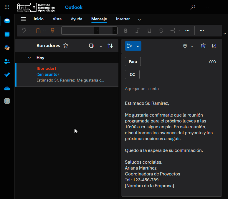 Ejemplo: Si está enviando una invitación para una reunión, en el espacio “para” se anotan las direcciones de los destinatarios y si desea que uno o varios miembros (como por ejemplo jefatura o administrador) reciba la misma invitación y esté enterado, utilice CC.