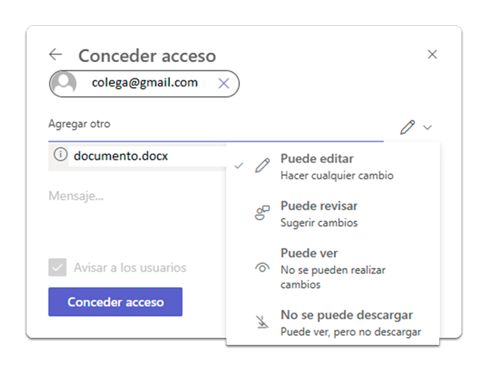 Imagen alusiva al compartir un archivo y el tipo de acceso que se le puede otorgar: