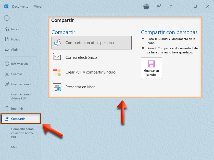 En la siguiente imagen, se visualiza la opción en Microsoft Word que permite compartir un documento desde la pestaña “Archivo”, opción “Compartir” y en ella: “Compartir con otras personas”: