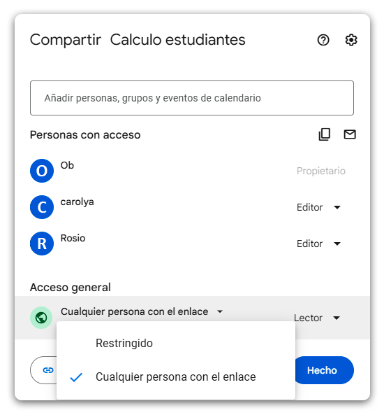 - 1. Al compartir un archivo o carpeta, seleccione en la propiedad de acceso general la opción "Cualquiera con el enlace".
