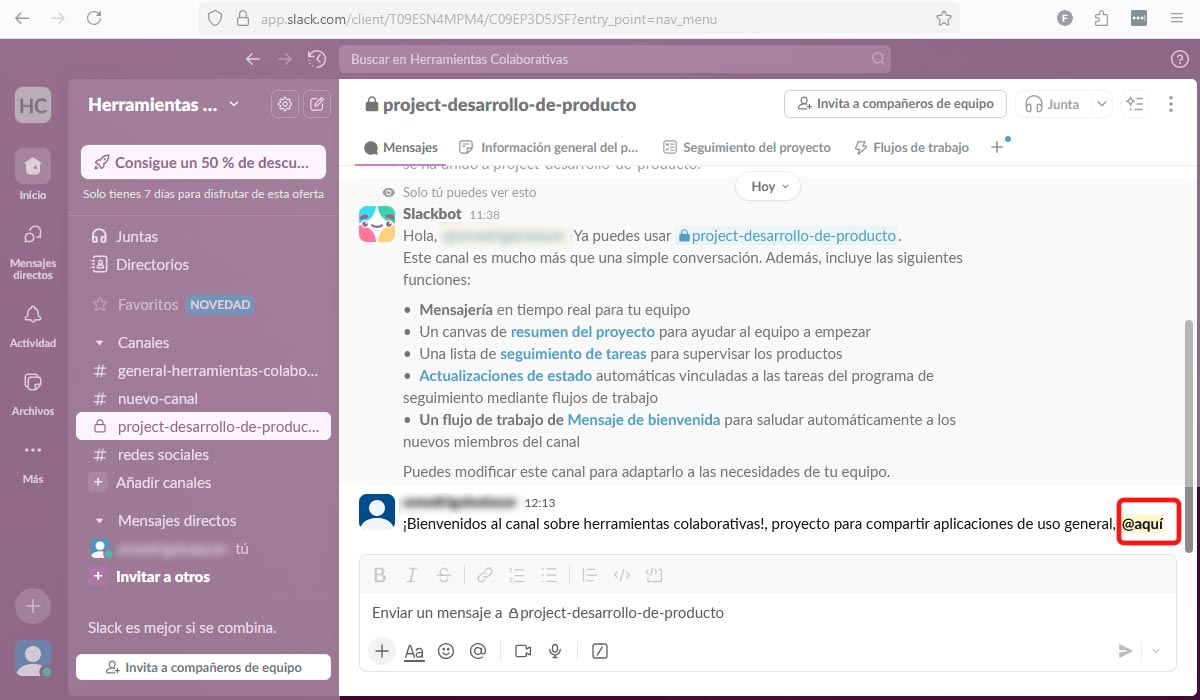 Utilice el @mención para llamar la atención de una persona miembro en un canal o mensaje directo (por ejemplo, @Juan Pérez, ¿puede revisar la propuesta?).