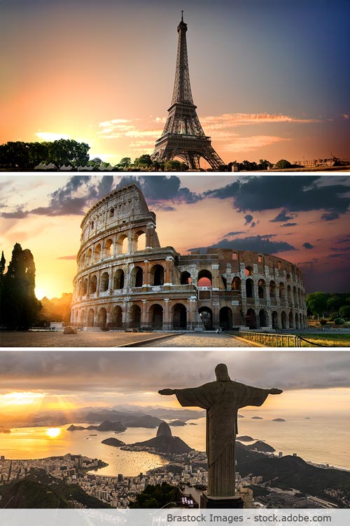 Ejemplos en el mundo: la torre Eiffel en París, el Coliseo Romano, El Cristo del Corcovado en Brasil, La Zona Arqueológica de Teotihuacán en el estado de México.