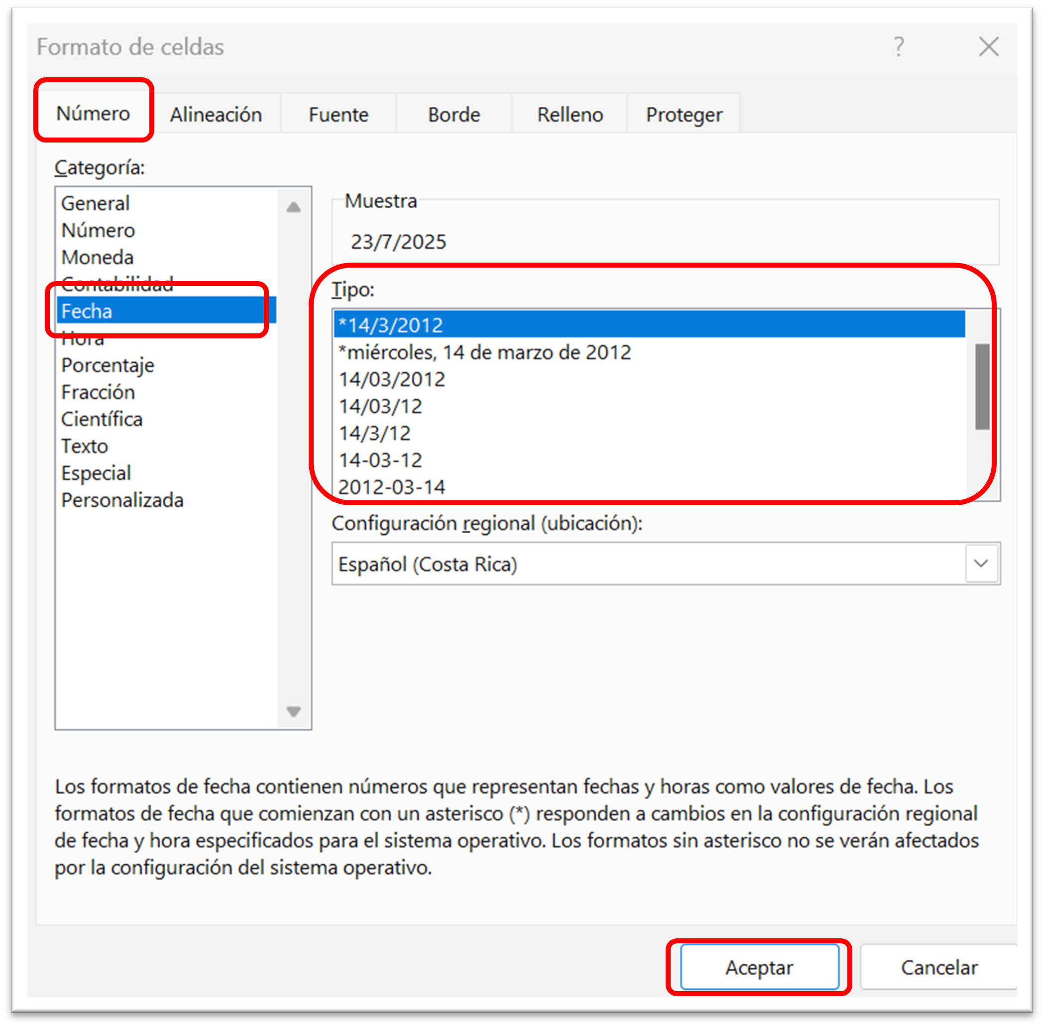 - 3. En la pestaña "Número", seleccione "Fecha" de la lista de categorías.