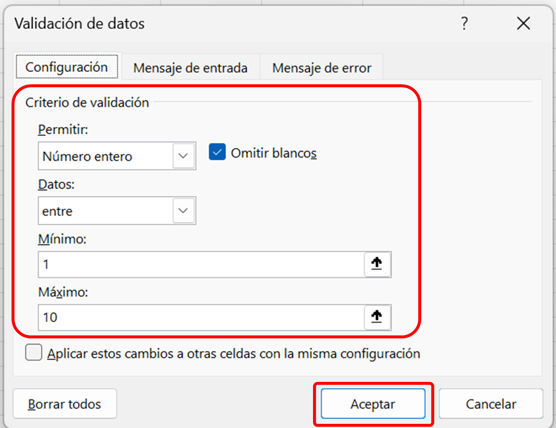 Ejemplo para números: Si selecciona "Número entero" y "entre", puede poner "1" en Mínimo y "100" en Máximo para solo permitir números del 1 al 100.