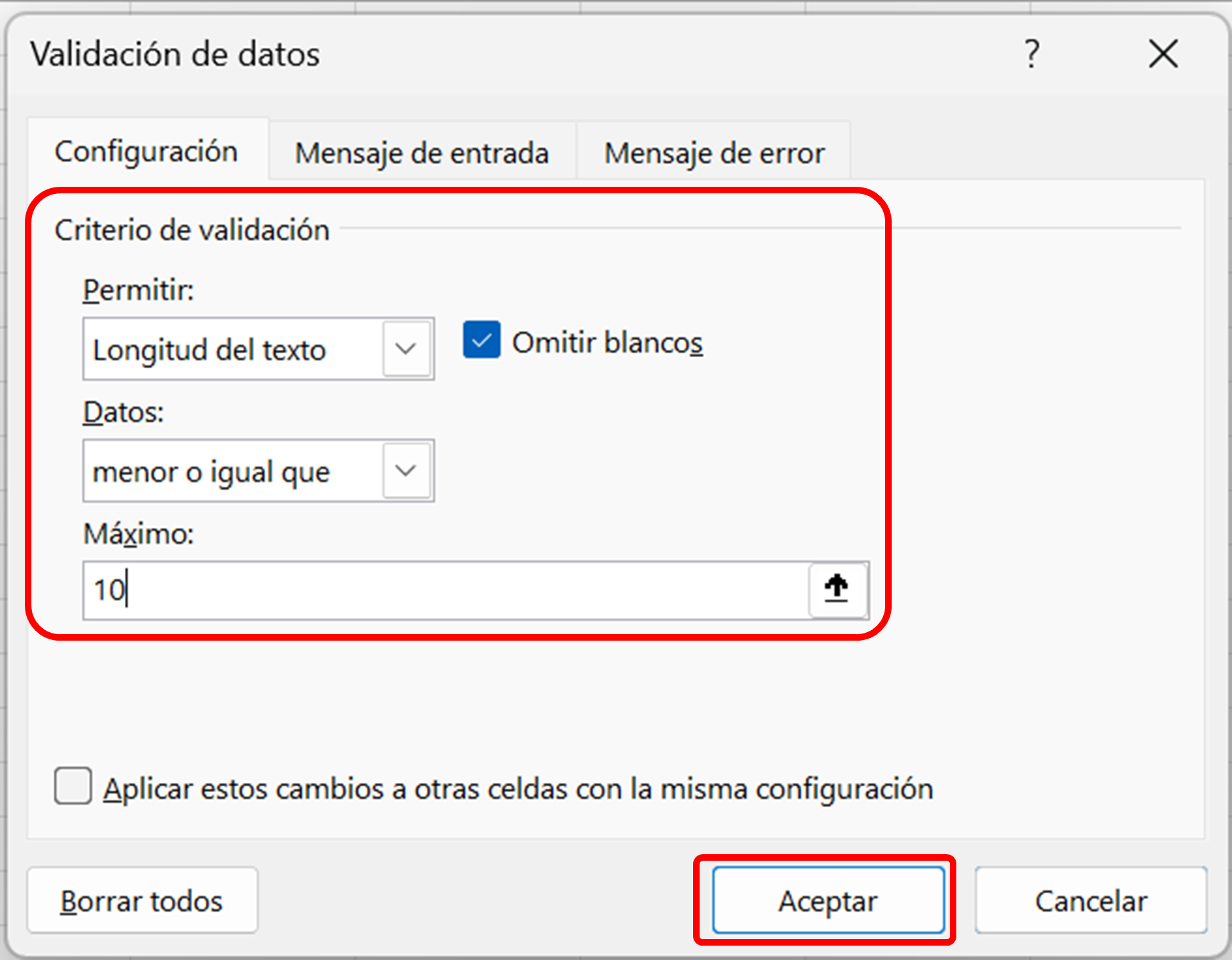 Ejemplo para texto: Si selecciona "Longitud de texto" y "menor o igual que", puede poner "10" en Máximo para que el texto no tenga más de 10 caracteres.