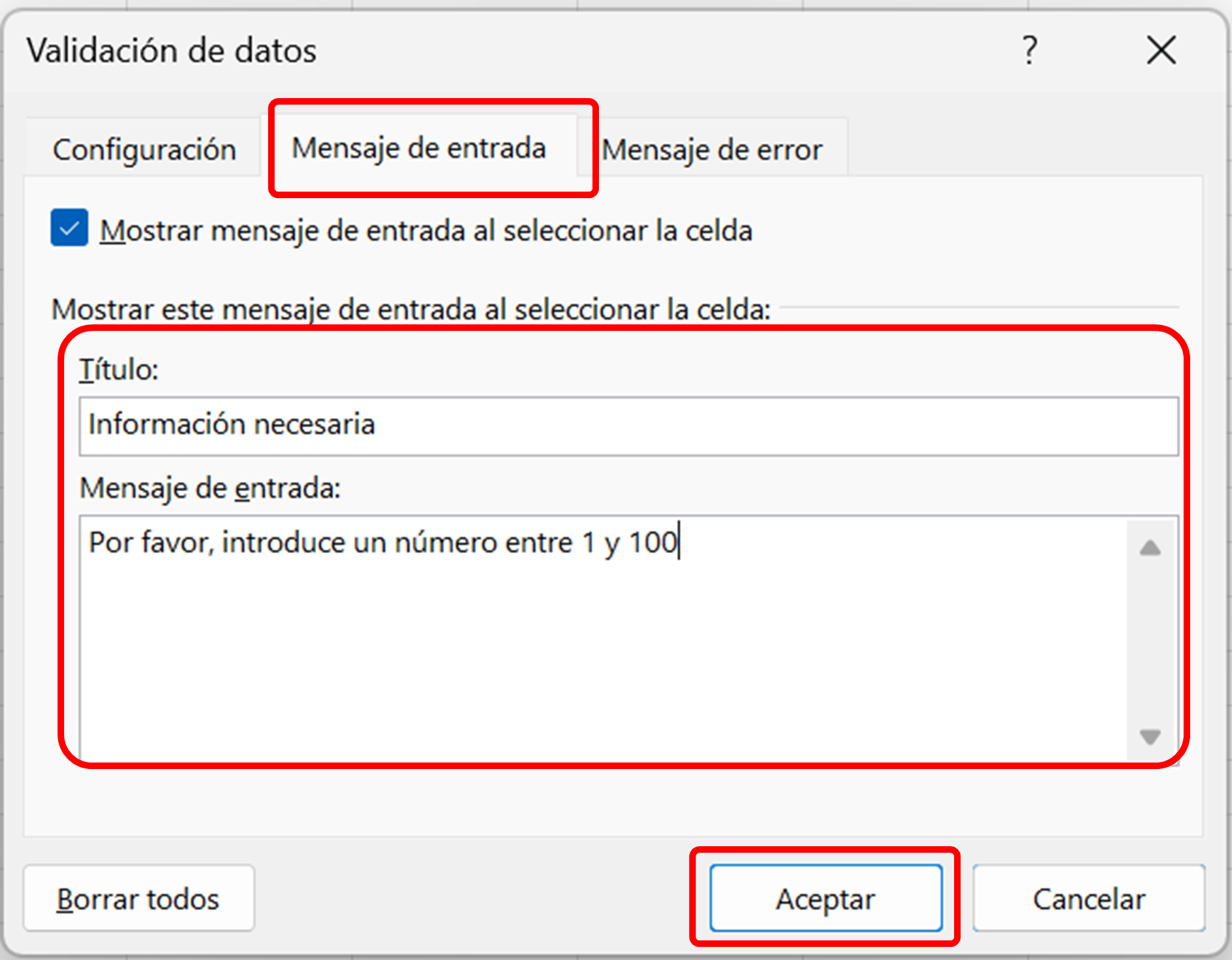 - · Marque la casilla "Mostrar mensaje de entrada al seleccionar la celda".