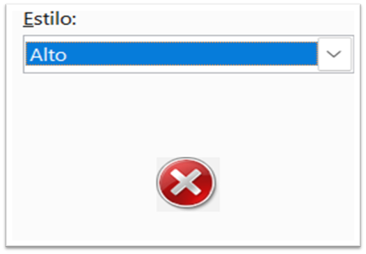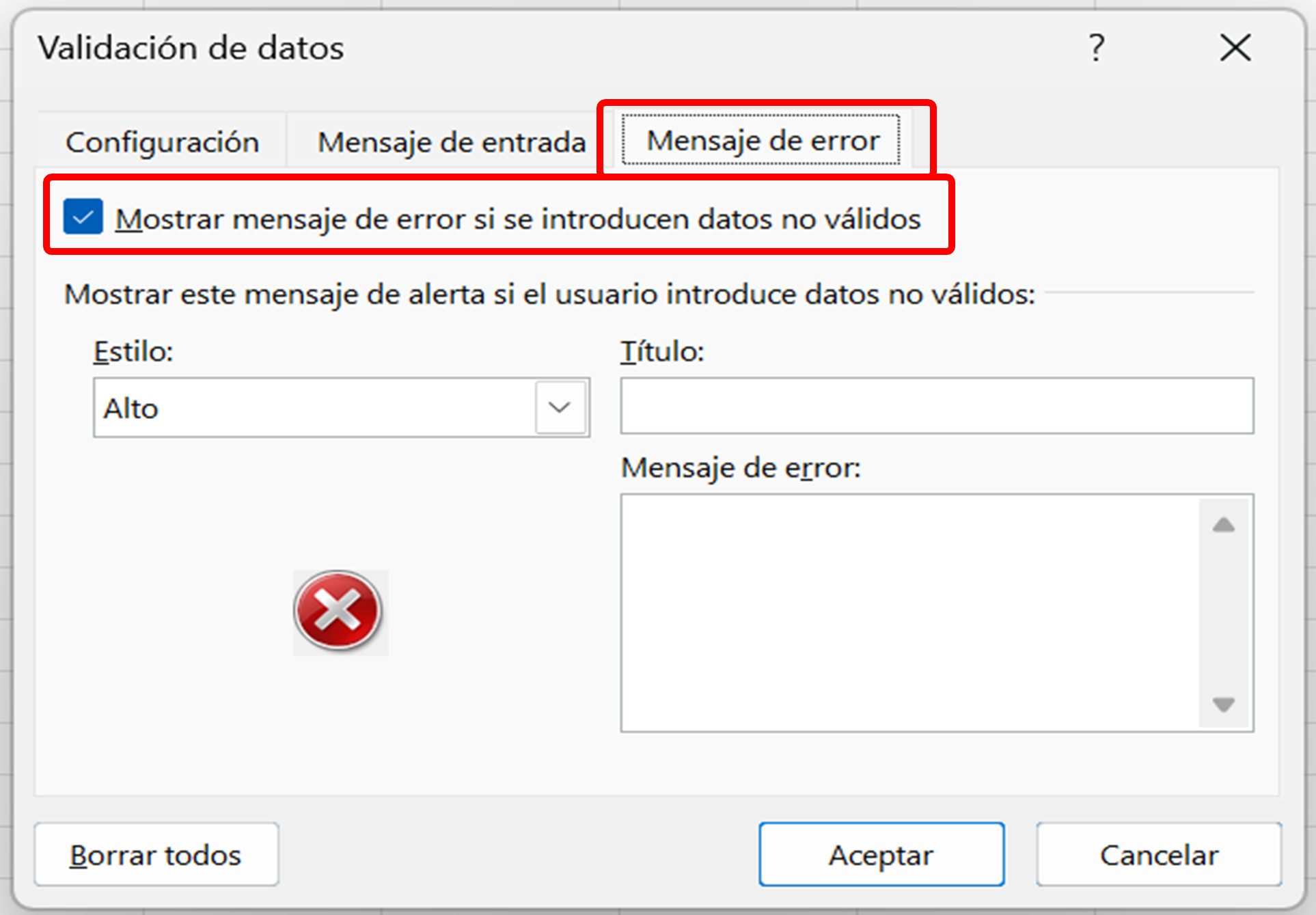 Alto: Impide la entrada de datos no válidos (la opción más restrictiva). Muestra un icono de "X" roja.