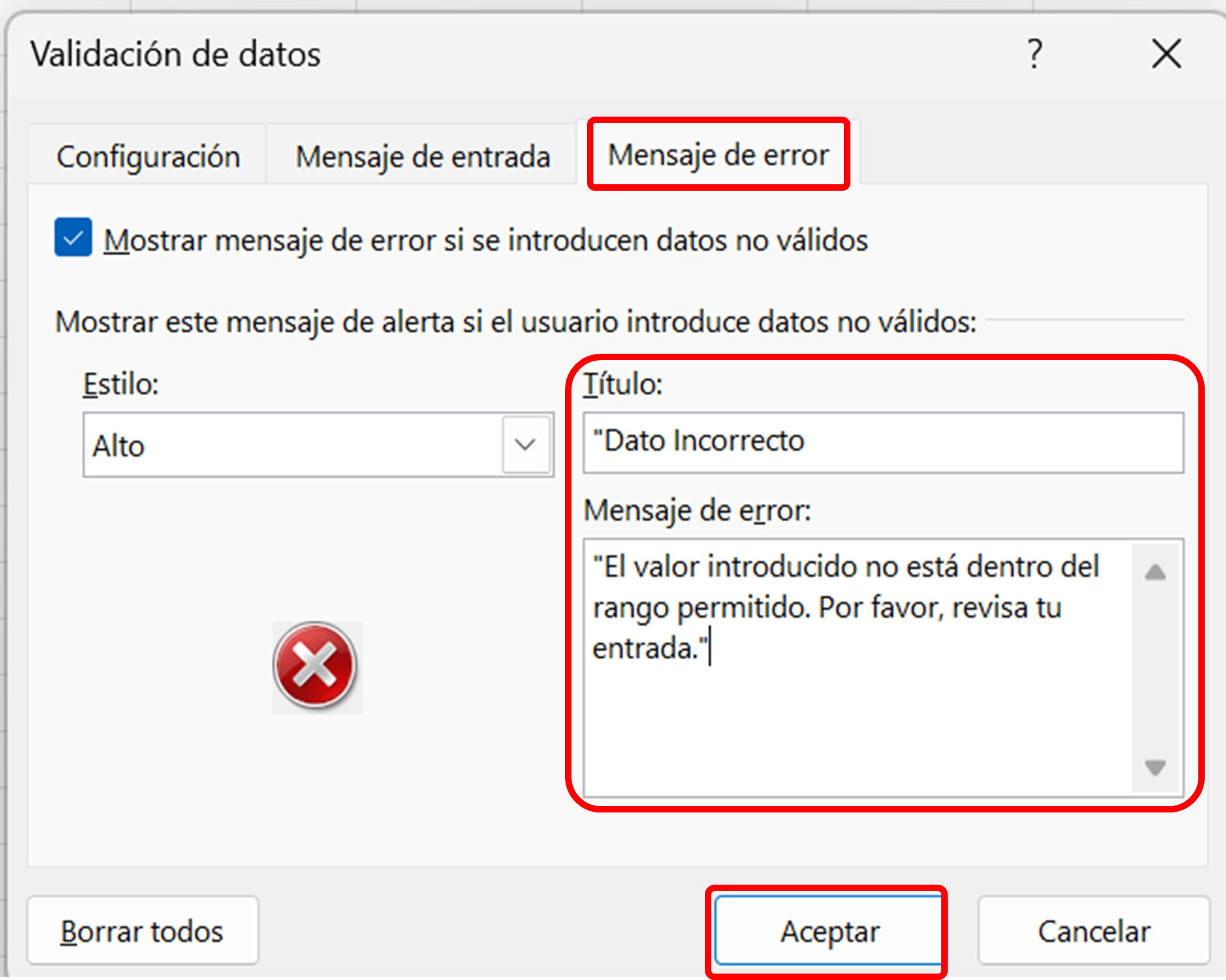 - · Marque la casilla "Mostrar mensaje de error si se introducen datos no válidos".