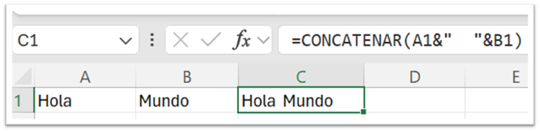 =CONCATENAR(A1, " ", B1)(El resultado es "Hola Mundo") O, usando el operador &:=A1 & " " & B1(El resultado es "Hola Mundo").