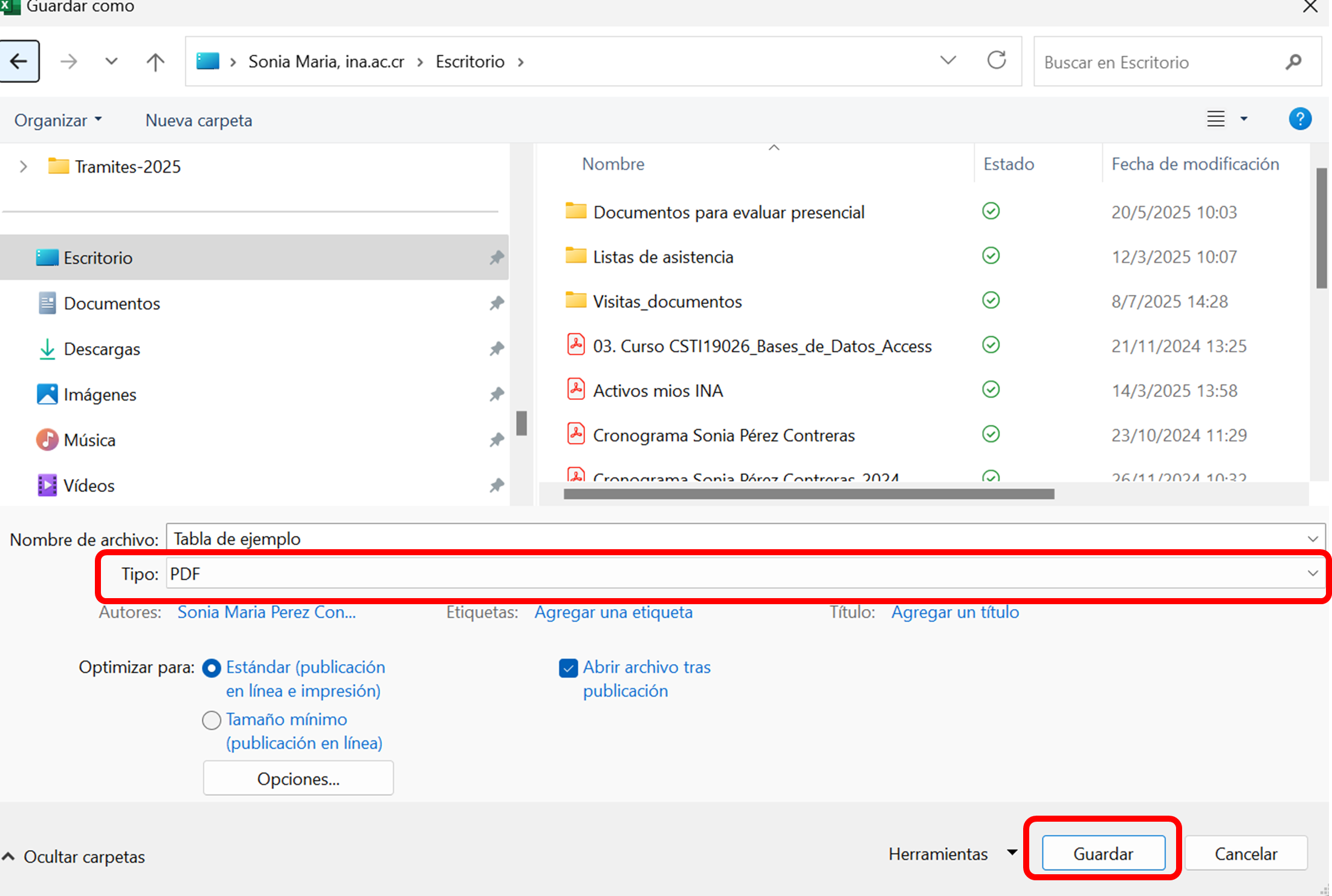 - 4. En el cuadro de diálogo Guardar como, haga clic en el menú desplegable Tipo y seleccione PDF.